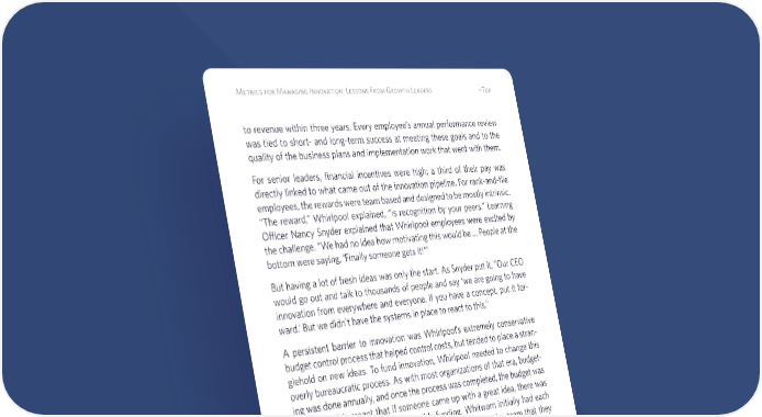 7 Metrics for Managing Innovation: Lessons From Growth Leaders ^Top to revenue within three years. Every employee’s annual performance review was tied to short- and long-term success at meeting these goals and to the quality of the business plans and implementation work that went with them. For senior leaders, financial incentives were high; a third of their pay was directly linked to what came out of the innovation pipeline. For rank-and-file employees, the rewards were team based and designed to be mostly intrinsic. “The reward,” Whirlpool explained, “is recognition by your peers.” Learning Officer Nancy Snyder explained that Whirlpool employees were excited by the challenge. “We had no idea how motivating this would be … People at the bottom were saying, ‘Finally someone gets it!'” But having a lot of fresh ideas was only the start. As Snyder put it, “Our CEO would go out and talk to thousands of people and say ‘we are going to have innovation from everywhere and everyone. If you have a concept, put it for- ward.’ But we didn’t have the systems in place to react to this.” A persistent barrier to innovation was Whirlpool’s extremely conservative budget control process that helped control costs, but tended to place a stran- glehold on new ideas. To fund innovation, Whirlpool needed to change this overly bureaucratic process. As with most organizations of that era, budget- ing was done annually, and once the process was completed, the budget was locked in. This meant that if someone came up with a great idea, there was no money to fund it. To create flexible funding, Whitwam initially had each region set up a seed fund for innovation and told the senior team that they had to fund all of the ideas that came forward, with no exceptions. If they turned someone down, the CEO told employees to come directly to him. This “end run” created an information organization structure, alongside the formal organization structure. In just two years Whirlpool’s “innovation pipeline” went from $1.3 billion to $3.3 billion. By 2005, seven years after launch, Whirlpool’s share price was at an all-time high, and the company was posting record results. Roughly