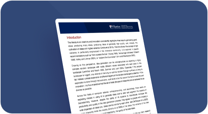 2 Introduction The literature on creativity and innovation consistently highlights three keys to generating good ideas: producing many ideas, producing ideas of generally high quality, and, notably, the cultivation of ideas with higher variance (Girotra et al 2010). The third driver, the concept of high variance, is particularly emphasized in the innovation community. It is captured in popular recommendations such as “think outside the box” (Young 1965), “encourage wild ideas” (Osborn 1948, Kelley and Littman 2001), or “explore the blue ocean” (Kim and Mauborgne 2005). Drawing on this perspective, idea generation can be conceptualized as exploring a highly complex solution landscape with vastly different values associated with each point in the landscape (Levinthal and March 1993, Sommer and Loch 2004). Especially if this solution landscape is rugged, any attempt of deriving an optimal solution through synthesis is likely to fail. Instead, a broad exploration of different regions of the solution landscape is called for. If this exploration is done through trial-and-error, as it tends to be the case in the field of creativity and innovation, it is thus imperative that the set of trials (the pool of ideas that are considered) be as diverse as possible. Across the fields of computer science, entrepreneurship, and psychology, there exists an exploding interest in using AI to generate ideas and to alter and augment the practice of brainstorming. However, despite the ability of AI systems to dramatically increase the productivity and quality of the idea generation process, they appear to grapple with creating a wide dispersion of ideas (i.e., ideas are too similar to each other, see Dell'Acqua et al 2023), which inherently limits the novelty (Girotra et al 2023) of the ideas, the variance of the idea quality, and ultimately, and most importantly, the quality of the best ideas. The apparent lack of dispersion in a set of AI generated ideas motivates our main research question we aim to address in this paper. How might one increase the diversity of an AI generated pool of ideas? Since our primary focus is on AI in the form of large language models (LLMs), increasing the diversity of a pool of ideas boils down to a matter of prompt engineering. We thus refine our research question to: How might one choose prompts in LLMs to increase the diversity of an AI generated pool of ideas? To find out what prompts lead to the most diverse idea pools, we compare multiple prompting strategies. This includes (1) minimal prompting, (2) instructing the LLM to take on different personas, (3) sharing creativity techniques from the existing literature with the LLM, and (4) Chain of Thought (CoT) prompting which asks the LLM to work in multiple, distinct steps. As