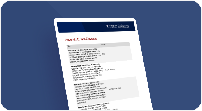 Appendix E: Idea Examples Idea Prompt SunCharge Pro: This versatile portable solar charger isn't just for powering your devices; it also features a built-in flashlight for emergencies and an FM radio to keep you informed. Whether you're studying in the park or backpacking for the weekend, stay powered and prepared. CoT Memory Foam Travel Pillow: A comfortable, supportive travel pillow made from high-quality memory foam. The Memory Foam Travel Pillow is designed to provide optimal neck support during long study sessions, flights, or road trips. Its compact size and removable, washable cover make it easy to carry and maintain. Cosine Similarity HoloStudy: HoloStudy is an interactive holographic study tool that projects 3D images, diagrams, or formulas onto any surface, transforming the study process into an immersive experience. Ideal for subjects like chemistry, math, or engineering, HoloStudy syncs with a companion app where students can create and share custom content, enhancing learning and collaboration. Hybrid Brainstorming SmartBinder: The SmartBinder is a customizable and reusable binder that includes a built-in calendar, planner, and whiteboard. Designed specifically for college students, it allows them to organize their class materials, assignments, and schedules in one convenient place. Made with eco-friendly materials, the SmartBinder is both durable and affordable. Turn Off Quick Notes Whiteboard Planner: A portable, reusable whiteboard planner that students can use to keep track of assignments, exams, and other important dates. Complete with a set of colorful dry erase markers, this planner can be easily hung on a dorm room wall or door. Tipping Study Buddy Desk Organizer: A compact, customizable desk organizer designed specifically for college students to keep their study materials and stationery in one place. It comes with HBR