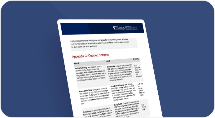 multiple compartments for holding items such as books, smartphones, glasses, and remote controls. The caddy can be easily attached to the side of a bed or a couch, making it perfect for dorm rooms and small apartments. Appendix C: Cosine Examples Idea A Idea B Similarity QuickHeat Mug: An insulated, battery- powered coffee mug that can heat beverages within minutes and maintain the temperature. Ideal for students who need a warm drink during long study sessions but don't have immediate access to a kitchen. StudyBuddy Lamp: A compact, portable LED desk lamp with built-in timers for the Pomodoro study technique, adjustable brightness levels, and a USB charging port for smartphones. It's designed to help students focus and manage their study time effectively. 0.36 (Different ideas, but similar text structure) PowerBand Wrist Charger: A wristband that doubles as a portable battery charger for devices. It's designed for the student on- the-go who needs a quick power boost for their phone or tablet without carrying extra gear. PortaPocket Storage Belt: A sleek, expandable storage belt that can hold essentials like keys, phone, wallet, and pens. It's designed for students to have quick access to their items without needing a bulky bag, especially when moving between classes. 0.55 (Not too similar, but still fairly high score) IllumiNotes: A set of highlighters with a built-in LED light at the tip to illuminate the page while studying in low-light conditions. This helps reduce eye strain and makes late-night studying more comfortable. StudyBuddy Lamp: A compact, portable LED desk lamp with built-in timers for the Pomodoro study technique, adjustable brightness levels, and a USB charging port for smartphones. It's designed to help students focus and manage their study time effectively. 0.59 (Similar goal) EcoCharge Hand Crank Charger: A hand- cranked USB charger that provides emergency power for smartphones or tablets, ideal for students during power outages or camping trips. ChargeBinder: A multi-functional binder that includes a built-in power bank to charge smartphones or tablets. Ideal for college students who need to keep their devices charged during back-to-back classes. 0.69 (Solve very similar problem) CoolSeat Gel Cushion: A portable gel seat cushion designed to keep students cool and comfortable during long periods of sitting in hot classrooms. MemoryFoam Seat Cushion: A portable, memory foam seat cushion designed to make long periods of sitting, like during lectures or study sessions, more comfortable. It can be easily carried in a backpack and fits onto various types of 0.74 (Almost identical)