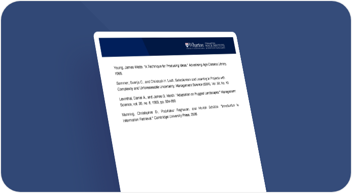 Young, James Webb. "A Technique for Producing Ideas." Advertising Age Classics Library, 1965. Sommer, Svenja C., and Christoph H. Loch, Selectionism and Learning in Projects with Complexity and Unforeseeable Uncertainty. Management Science (2004), Vol. 50, No. 10 Levinthal, Daniel A., and James G. March. "Adaptation on Rugged Landscapes." Management Science, vol. 39, no. 8, 1993, pp. 934-950. Manning, Christopher D., Prabhakar Raghavan, and Hinrich Schütze. "Introduction to Information Retrieval." Cambridge University Press, 2008