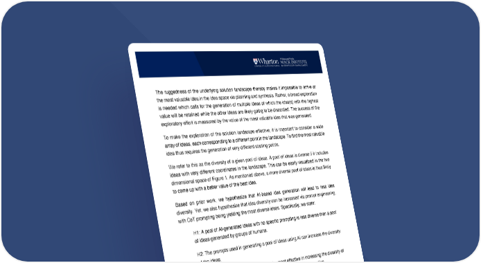6 The ruggedness of the underlying solution landscape thereby makes it impossible to arrive at the most valuable idea in the idea space via planning and synthesis. Rather, a broad exploration is needed which calls for the generation of multiple ideas of which the idea(s) with the highest value will be retained while the other ideas are likely going to be discarded. The success of the exploratory effort is measured by the value of the most valuable idea that was generated. To make the exploration of the solution landscape effective, it is important to consider a wide array of ideas, each corresponding to a different point in the landscape. To find the most valuable idea thus requires the generation of very different starting points. We refer to this as the diversity of a given pool of ideas. A pool of ideas is diverse if it includes ideas with very different coordinates in the landscape. This can be easily visualized in the two dimensional space of Figure 1. As mentioned above, a more diverse pool of ideas is thus likely to come up with a better value of the best idea. Based on prior work, we hypothesize that AI-based idea generation will lead to less idea diversity. Yet, we also hypothesize that idea diversity can be increased via prompt engineering, with CoT prompting being yielding the most diverse ideas. Specifically, we state: H1: A pool of AI-generated ideas with no specific prompting is less diverse than a pool of ideas generated by groups of humans. H2: The prompts used in generating a pool of ideas using AI can increase the diversity of the ideas. H3: Chain-of-Thought prompting will be the most effective in increasing the diversity of the ideas. It might or might not outperform human group idea generation. Prompting Strategies for Innovation and Brainstorming As a baseline for comparison, we use a pool consisting of 100 randomly chosen ideas generated by Wharton MBA students. This is the same pool of ideas used as in Girotra et al 2023. It is important to note that students were not tasked with generating 100 ideas at once, but instead the pool is an aggregation of ideas from multiple students. We want to explore how different ways of prompting the LLM might impact the diversity of the resulting idea pools. In total, we evaluate 35 prompting strategies.