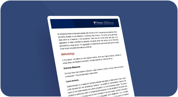 8 By comparing these 35 idea pools created with the help of GPT-4 we set up a competition which prompting strategy is most effective in increasing idea diversity. The human group generated ideas serve as a baseline in this competition. Note that the human group idea pool is an aggregation of ideas submitted by separate individuals rather than being a list of 100 ideas generated by a single group. This aggregation of independently generated ideas gives an edge to the human innovators and sets up a high bar. Methodology In this section, we define our key outcome metrics, which are Cosine Similarity, Number of unique ideas, and Speed of exhaustion. We also describe our technical set-up. Outcome Measures We have three main outcome measures: cosine similarity, number of unique ideas and speed of exhaustion. They are discussed in detail below. Cosine Similarity Cosine similarity is a measure of similarity between two ideas (or other forms of text). Since LLMs translate text into embeddings (vectors), it is possible to mathematically measure the cosine of the angle between two vectors projected in a multi-dimensional space. The cosine similarity is particularly useful in comparing texts because it is less sensitive to the overall size of the documents; it focuses more on their orientation in the vector space. Just like in Geometry, the cosine of the angle between the vectors is calculated, which ranges from -1 to 1. A cosine similarity of 1 implies that the two ideas are very similar, having a cosine angle of 0 degrees implies that they are orthogonal to each other. While cosine similarity is an accepted measure for comparing text similarity it is not without problems. For instance, changing the embeddings model could yield dramatically different results depending on the training even if it was optimized for the same purpose. In addition, the cosine similarity might not capture all the dimensions of idea similarity that a human might consider. The alternative to using cosine similarity is to measure idea diversity by relying on human raters. However, rating idea similarity is not only a very subjective task, it also does not scale well, i.e.,