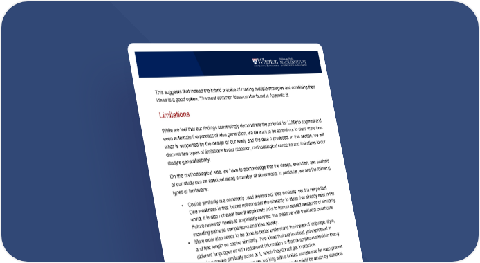 18 This suggests that indeed the hybrid practice of running multiple strategies and combining their ideas is a good option. The most common ideas can be found in Appendix B. Limitations While we feel that our findings convincingly demonstrate the potential for LLM’s to augment and even automate the process of idea generation, we do want to be careful not to claim more than what is supported by the design of our study and the data it produced. In this section, we will discuss two types of limitations to our research, methodological concerns and limitations to our study’s generalizability. On the methodological side, we have to acknowledge that the design, execution, and analysis of our study can be criticized along a number of dimensions. In particular, we see the following types of limitations: • Cosine similarity is a commonly used measure of idea similarity, yet it is not perfect. One weakness is that it does not consider the similarity to ideas that already exist in the world. It is also not clear how it empirically links to human scored measures of similarity. Future research needs to empirically connect this measure with traditional constructs including pairwise comparisons and idea novelty. • More work also needs to be done to better understand the impact of language, style, and text length on cosine similarity. Two ideas that are identical, yet expressed in different languages or with redundant information in their descriptions should in theory obtain a cosine similarity score of 1, which they do not get in practice. • For computational reasons, we are working with a limited sample size for each prompt. Given the stochastic nature of LLMs, some of our results might be driven by statistical noise. • Diversity can be obtained by sacrificing idea quality. There exist countless ideas that have no real user need or that are obviously infeasible (a pill that makes college students healthy, good looking, and smart). We focus on diversity as an end goal. Future research needs to show that this diversity indeed leads to a better best idea. • Our “team human” was represented as an aggregation of ideas working individually. This method is likely to have created a much more diverse idea pool than any human individual or brainstorming team would have been capable of producing.