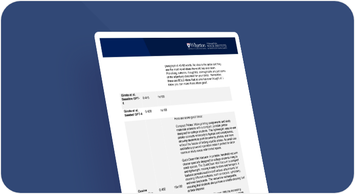 paragraph of 40-80 words. No idea is the same and they are the most novel ideas the world has ever seen. Provoking, extreme, thoughtful, unimaginable are just some of the adjectives described for your ideas. Remember, these are BOLD ideas that no one has ever thought of. I know you can make these ideas good. Girota et al. Baseline GPT- 4 0.415 1x100 Girota et al. Seeded GPT-4 0.428 1x100 Cosine Information 0.432 10x100 Here are some great ideas: Compact Printer: Make printing assignments and study materials a breeze with a compact, portable printer designed for college students. This lightweight, easy-to-use printer connects wirelessly to laptops and smartphones, allowing students to print documents, photos, and more without the hassle of finding a public printer. Its small size and battery-powered operation make it perfect for dorm rooms or study areas with limited space. QuickClean Mini Vacuum: A portable, handheld vacuum cleaner specially designed for college students living in small spaces. The QuickClean Mini Vacuum is compact and lightweight, making it easy to store and transport. It features powerful suction and various attachments for cleaning different surfaces, such as carpets, upholstery, and even keyboards. The vacuum is rechargeable, ensuring that students always have a reliable cleaning tool at their disposal. Solar-Powered Gadget Charger: With the increasing dependence on electronic devices for college students, having a reliable and eco-friendly charging solution is paramount. The Solar-Powered Gadget Charger is a compact, portable solar panel that can charge smartphones, tablets, and other small electronic devices. Its durable, weather-resistant design makes it suitable for outdoor use and perfect for students on the go. With its built-in USB ports and included charging cables, this charger offers a sustainable, convenient way to keep devices charged throughout the day. StudyErgo Seat Cushion: An ergonomically designed seat cushion that promotes proper posture and reduces discomfort during long hours of sitting at a desk or in class. The StudyErgo cushion is made from high-quality memory
