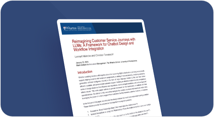 Reimagining Customer Service Journeys with LLMs: A Framework for Chatbot Design and Workflow Integration Lennart Meincke and Christian Terwiesch1 January 23, 2025 Mack Institute for Innovation Management, The Wharton School, University of Pennsylvania Introduction Whether assisting travelers with inquiries about their upcoming flight or destination, providing mental health support, helping students with homework assignments, or aiding in financial planning, chatbots powered by generative artificial intelligence (GenAI) in the form of large language models (LLMs) can help deliver efficient, scalable, and personalized customer support. Building an effective chatbot involves navigating a series of design decisions that influence user experience, technical implementations, and various legal and ethical issues. This white paper outlines a general framework for the functionality of chatbots and their operational use. Our aim is to help executives navigate the complex decisions that need to be made when leveraging the power of LLMs to support their customers, be they travelers, patients, students, or investors. In the first part of this paper, we articulate five design choices that need to be made when building a chatbot. These choices provide the answers to five important managerial questions: 1. Focused vs. Broad Knowledge Base (“How much does the chatbot know?”) 2. Isolated Interactions vs. Long-time Relationships (“Does the chatbot remember users over multiple episodes?”) 3. Proactive vs. Responsive (“Does the user reach out to the chatbot or the chatbot to the user?”) 4. Static vs. Dynamic (“Does the chatbot learn about a user or a user population over time?”) 5. Quality Assurance (“How is the quality of the chatbot’s output assured?”) These five dimensions create a taxonomy of chatbots. In the second part of the paper, we discuss different modes of interactions between the chatbot and the human operators. Indeed, a successful use of chatbots is more than just a matter of designing and building a new technology. Rather, the chatbot must be integrated into the workflow of the organization. At the 1 Meincke, Terwiesch: The Wharton School, 500 Huntsman Hall, 3730 Walnut Street, Philadelphia, PA 19104, lennart@sas.upenn.edu, terwiesch@wharton.upenn.edu