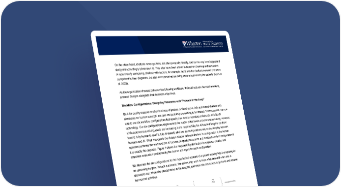 On the other hand, chatbots never get tired, are always equally friendly, and can be very knowledgeable if designed accordingly (dimension 1). They also have been shown to be rather charming and persuasive. A recent study comparing chatbots with doctors, for example, found that the chatbots were not only more competent in their diagnosis, but also were perceived as being more empathetic by the patients (Ayers et al. 2023). As the organization chooses between the following workflows, it should evaluate the most promising process designs alongside their business objectives. Workflow Configurations: Designing Processes with “Humans in the Loop” Be it for quality reasons or other business objectives outlined above, fully automated chatbots with absolutely no human oversight are rare and probably are nothing to be desired. For this reason, we now turn to our six workflow configurations that specify how human operators collaborate with GenAI technology. Our six configurations might remind the reader of the levels of autonomous driving. However, while autonomous driving levels are increasing in the responsibility the AI has in driving the car (from level 0: fully human to level 5: fully AI-based) all of our six configurations rely on an interplay between humans and AI. What changes is the division of labor between the two: in configuration 1, the human operator performs the work and the AI focuses on quality assurance and feedback while in configuration 6 it is exactly the opposite. Figure 1 shows the responsibility distribution for response creation and response evaluation performed by the human and agent for each configuration. We illustrate the six configurations for the hypothetical scenario of a patient seeking help in preparing for an upcoming surgery. In such a scenario, the patient may want to know what and until when she is allowed to eat, when she should arrive at the hospital, and when she can expect to go home and resume her normal activities. Figure 1: Responsibility distribution for response creation and response evaluation between human and AI