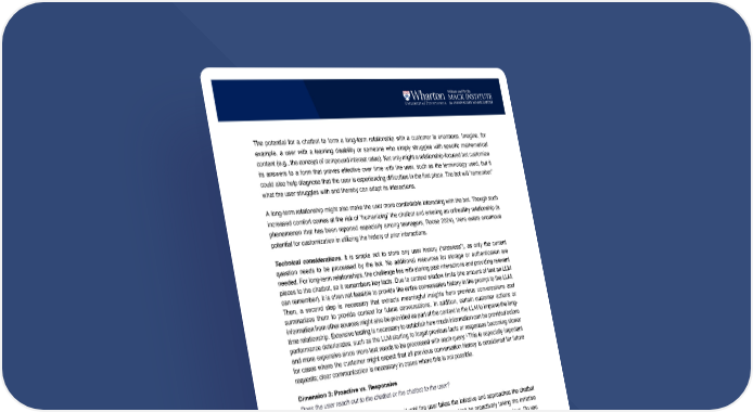 The potential for a chatbot to form a long-term relationship with a customer is enormous. Imagine, for example, a user with a learning disability or someone who simply struggles with specific mathematical content (e.g., the concept of compound interest rates). Not only might a relationship-focused bot customize its answers to a form that proves effective over time with the user, such as the terminology used, but it could also help diagnose that the user is experiencing difficulties in the first place. The bot will “remember” what the user struggles with and thereby can adapt its interactions. A long-term relationship might also make the user more comfortable interacting with the bot. Though such increased comfort comes at the risk of “humanizing” the chatbot and entering an unhealthy relationship (a phenomenon that has been reported especially among teenagers, Roose 2024), there exists enormous potential for customization in utilizing the history of prior interactions. Technical considerations. It is simple not to store any user history (“stateless”), as only the current question needs to be processed by the bot. No additional resources for storage or authentication are needed. For long-term relationships, the challenge lies with storing past interactions and providing relevant pieces to the chatbot, so it remembers key facts. Due to context window limits (the amount of text an LLM can remember), it is often not feasible to provide the entire conversation history in the prompt to the LLM. Then, a second step is necessary that extracts meaningful insights from previous conversations and summarizes them to provide context for future conversations. In addition, certain customer actions or information from other sources might also be provided as part of the context to the LLM to improve the long- time relationship. Extensive testing is necessary to establish how much information can be provided before performance deteriorates, such as the LLM starting to forget previous facts or responses becoming slower and more expensive since more text needs to be processed with each query.ii This is especially important for cases where the customer might expect that all previous conversation history is considered for future requests; clear communication is necessary in cases where this is not possible. Dimension 3: Proactive vs. Responsive Does the user reach out to the chatbot or the chatbot to the user? Most chatbots are responsive, i.e., they wait until the user takes the initiative and approaches the chatbot with a request. However, there is no reason why the chatbot shouldn’t be proactively taking the initiative (“Hi Joe, your upcoming flight to Paris is in 3 days. It looks like it will be rainy for the first few days. Do you want to learn more about must-visit indoor spots in the city?”). Such proactive bots might increase engagement by offering timely information or reminders, something that is well-studied in the medical domain (Volpp et al. 2017, Lekwijit et al. 2024). Currently, most chatbots do not reach out proactively by themselves. There are several reasons for this. In general, chatbots mimic the workflow of a customer support center or a help desk, which is by nature responsive. In addition, deploying a responsive chatbot is very simple on a technical level, as that is precisely what the chatbots are designed to do. Some recent examples of companies moving toward proactive chatbots include platforms such as Character.ai that have experimented with chatbots sending messages to users who have not engaged with