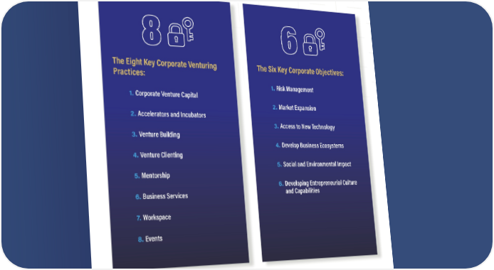 7 Matching Venturing Practices to Corporate Goals We have identified eight key corporate venturing practices that the 500 largest global corporations employ in pursuit of six main corporate goals. Notably, these practices are often used in combination with one another, with each company determining its own bundle that best meets its objectives. The Six Key Corporate Objectives: 1. Risk Management 2. Market Expansion 3. Access to New Technology 4. Develop Business Ecosystems 5. Social and Environmental Impact 6. Developing Entrepreneurial Culture and Capabilities The Eight Key Corporate Venturing Practices: 1. Corporate Venture Capital 2. Accelerators and Incubators 3. Venture Building 4. Venture Clienting 5. Mentorship 6. Business Services 7. Workspace 8. Events