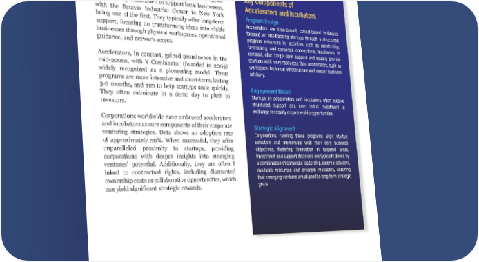 15 Accelerators and Incubators: Fast-Tracking Innovation Accelerators and incubators are structured programs designed to nurture startups and early-stage businesses by providing financial, human, and social capital. These programs have distinct origins and objectives. Incubators, which date back to the 1950s, were initially established to support local businesses, with the Batavia Industrial Center in New York being one of the first. They typically offer long-term support, focusing on transforming ideas into viable businesses through physical workspaces, operational guidance, and network access. Accelerators, in contrast, gained prominence in the mid-2000s, with Y Combinator (founded in 2005) widely recognized as a pioneering model. These programs are more intensive and short-term, lasting 3-6 months, and aim to help startups scale quickly. They often culminate in a demo day to pitch to investors. Corporations worldwide have embraced accelerators and incubators as core components of their corporate venturing strategies. Data shows an adoption rate of approximately 50%. When successful, they offer unparalleled proximity to startups, providing corporations with deeper insights into emerging ventures’ potential. Additionally, they are often l inked to contractual rights, including discounted ownership costs or collaborative opportunities, which can yield significant strategic rewards. Key Components of Accelerators and Incubators Program Design Accelerators are time-bound, cohort-based initiatives focused on fast-tracking startups through a structured program enhanced by activities such as mentorship, fundraising, and corporate connections. Incubators, in contrast, offer longer-term support and usually provide startups with more resources than accelerators, such as workspace, technical infrastructure and deeper business advisory. Engagement Model Startups in accelerators and incubators often receive structured support and even initial investment in exchange for equity or partnership opportunities. Strategic Alignment Corporations running these programs align startup selection and mentorship with their core business objectives, fostering innovation in targeted areas. Investment and support decisions are typically driven by a combination of corporate leadership, external advisors, available resources and program managers, ensuring that emerging ventures are aligned to long-term strategic goals.