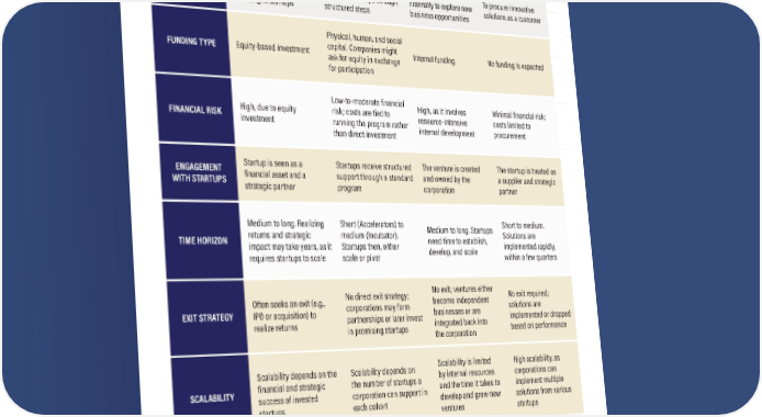 21 Table 1. Comparative Overview among the 4 Corporate Venturing Programs FEATURE Corporate Venture Capital (CVC) Accelerators & Incubators Venture Building Venture Clienting PURPOSE To gain financial returns and strategic benefits by investing in startups To initiate and fast-track the growth of startups through structured steps To create new ventures internally to explore new business opportunities To procure innovative solutions as a customer FUNDING TYPE Equity-based investment Physical, human, and social capital. Companies might ask for equity in exchange for participation Internal funding No funding is expected FINANCIAL RISK High, due to equity investment Low-to-moderate financial risk; costs are tied to running the program rather than direct investment High, as it involves resource-intensive internal development Minimal financial risk; costs limited to procurement ENGAGEMENT WITH STARTUPS Startup is seen as a financial asset and a strategic partner Startups receive structured support through a standard program The venture is created and owned by the corporation The startup is treated as a supplier and strategic partner TIME HORIZON Medium to long. Realizing returns and strategic impact may take years, as it requires startups to scale Short (Accelerators) to medium (Incubator). Startups then, either scale or pivot Medium to long. Startups need time to establish, develop, and scale Short to medium. Solutions are implemented rapidly, within a few quarters EXIT STRATEGY Often seeks an exit (e.g., IPO or acquisition) to realize returns No direct exit strategy; corporations may form partnerships or later invest in promising startups No exit; ventures either become independent businesses or are integrated back into the corporation No exit required; solutions are implemented or dropped based on performance SCALABILITY Scalability depends on the financial and strategic success of invested startups Scalability depends on the number of startups a corporation can support in each cohort Scalability is limited by internal resources and the time it takes to develop and grow new ventures High scalability, as corporations can implement multiple solutions from various startups
