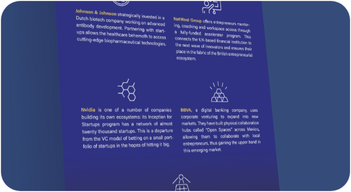 Total Energies, a French energy conglomerate, is an example of using corporate venturing to achieve social or environmental impact. Their $400 million Total Carbon Neutrality Ventures funds startups that work towards lowering emissions. NatWest Group offers entrepreneurs mentor- ing, coaching and workspace access through a fully-funded accelerator program. This connects the UK-based financial institution to the next wave of innovators and ensures their place in the fabric of the British entrepreneurial ecosystem. Nvidia is one of a number of companies building its own ecosystems: its Inception for Startups program has a network of almost twenty thousand startups. This is a departure from the VC model of betting on a small port- folio of startups in the hopes of hitting it big. BBVA, a digital banking company, uses corporate venturing to expand into new markets. They have built physical collaboration hubs called “Open Spaces” across Mexico, allowing them to collaborate with local entrepreneurs, thus gaining the upper hand in this emerging market. Johnson & Johnson strategically invested in a Dutch biotech company working on advanced antibody development. Partnering with start- ups allows the healthcare behemoth to access cutting-edge biopharmaceutical technologies. Case Snapshots: Startup–Corporate Symbiosis