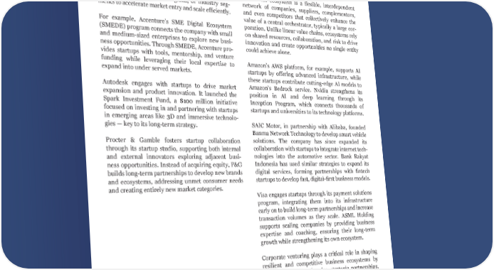 26 Market Expansion Corporations often collaborate with startups in new or niche markets, specific regions, or industry seg- ments to accelerate market entry and scale efficiently. For example, Accenture’s SME Digital Ecosystem (SMEDE) program connects the company with small and medium-sized enterprises to explore new busi- ness opportunities. Through SMEDE, Accenture pro- vides startups with tools, mentorship, and venture funding while leveraging their local expertise to expand into under served markets. Autodesk engages with startups to drive market expansion and product innovation. It launched the Spark Investment Fund, a $100 million initiative focused on investing in and partnering with startups in emerging areas like 3D and immersive technolo- gies — key to its long-term strategy. Procter & Gamble fosters startup collaboration through its startup studio, supporting both internal and external innovators exploring adjacent busi- ness opportunities. Instead of acquiring equity, P&G builds long-term partnerships to develop new brands and ecosystems, addressing unmet consumer needs and creating entirely new market categories. Develop Business Ecosystems A business ecosystem is a flexible, interdependent network of companies, suppliers, complementors, and even competitors that collectively enhance the value of a central orchestrator, typically a large cor- poration. Unlike linear value chains, ecosystems rely on shared resources, collaboration, and risk to drive innovation and create opportunities no single entity could achieve alone. Amazon’s AWS platform, for example, supports AI startups by offering advanced infrastructure, while these startups contribute cutting-edge AI models to Amazon’s Bedrock service. Nvidia strengthens its position in AI and deep learning through its Inception Program, which connects thousands of startups and universities to its technology platforms. SAIC Motor, in partnership with Alibaba, founded Banma Network Technology to develop smart vehicle solutions. The company has since expanded its collaboration with startups to integrate internet tech- nologies into the automotive sector. Bank Rakyat Indonesia has used similar strategies to expand its digital services, forming partnerships with fintech startups to develop fast, digital-first business models. Visa engages startups through its payment solutions program, integrating them into its infrastructure early on to build long-term partnerships and increase transaction volumes as they scale. ASML Holding supports scaling companies by providing business expertise and coaching, ensuring their long-term growth while strengthening its own ecosystem. Corporate venturing plays a critical role in shaping resilient and competitive business ecosystems by driving innovation, forming strategic partnerships, and cultivating future customers.