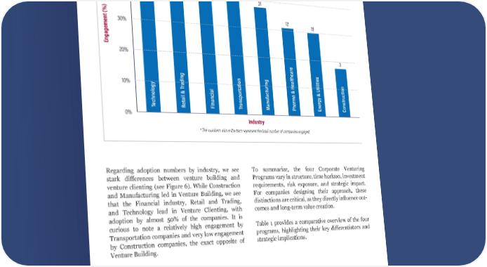 20 Regarding adoption numbers by industry, we see stark differences between venture building and venture clienting (see Figure 6). While Construction and Manufacturing led in Venture Building, we see that the Financial industry, Retail and Trading, and Technology lead in Venture Clienting, with adoption by almost 50% of the companies. It is curious to note a relatively high engagement by Transportation companies and very low engagement by Construction companies, the exact opposite of Venture Building. To summarize, the four Corporate Venturing Programs vary in structure, time horizon, investment requirements, risk exposure, and strategic impact. For companies designing their approach, these distinctions are critical, as they directly influence out- comes and long-term value creation. Table 1 provides a comparative overview of the four programs, highlighting their key differentiators and strategic implications. Figure 6. Forbes 500 Companies’ Engagement with Venture Clienting by Industry* Engagement (%) Industry 50% 20% 30% 40% 10% 0% Technology Retail & Trading Financial Transportation Manufacturing Pharma & Healthcare Energy & Utilities Construction 28 28 6 12 3 31 19 72 * The numbers above the bars represent the total number of companies engaged.