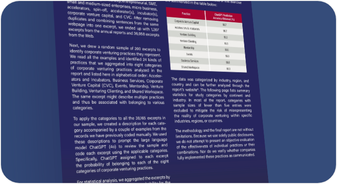 36 Data Collection and Initial Validation The construction of the dataset started with searching for the companies’ annual reports and websites for evidence of corporate venturing activities using sentences that include at least one keyword from the following dictionary list: entrepreneurs, small business, startup(s), startupper, new business, entrepreneur, entrepreneurship, entrepreneurial, SME, small and medium-sized enterprises, micro business, accelerators, spin-off, accelerator(s), incubator(s), corporate venture capital, and CVC. After removing duplicates and combining sentences from the same webpage into one excerpt, we ended up with 1,207 excerpts from the annual reports and 36,958 excerpts from the Web. Next, we drew a random sample of 200 excerpts to identify corporate venturing practices they represent. We read all the examples and identified 24 kinds of practices that we aggregated into eight categories of corporate venturing practices analyzed in the report and listed here in alphabetical order: Acceler- ators and Incubators, Business Services, Corporate Venture Capital (CVC), Events, Mentorship, Venture Building, Venturing Clienting, and Shared Workspace. The same excerpt might describe multiple practices and thus be associated with belonging to various categories. To apply the categories to all the 38,165 excerpts in our sample, we created a description for each cate- gory accompanied by a couple of examples from the records we have previously coded manually. We used these descriptions to prompt the large language model ChatGPT (4o) to review the sample and code each excerpt using the applicable categories. Specifically, ChatGPT assigned to each excerpt the probability of belonging to each of the eight categories of corporate venturing practices. For statistical analysis, we aggregated the excerpts by company and took the maximum probability for the excerpts in each category to indicate the company’s likelihood of adopting the corresponding venturing practice. We used an aggregate probability higher than 0.5 to demonstrate the company’s adoption of the corresponding practice. To assess the accuracy of ChatGPT’s coding, we drew a random sample of 30 companies for each corporate venturing practice. We verified the evidence in our database by accessing the corresponding web pages and other online sources. The results of this exercise are summarized in the table below: Practice ChatGPT Prediction Accuracy Obtained (%) Corporate Venture Capital 86.7 Accelerators & Incubators 96.7 Venture Building 93.3 Venture Clienting 93.3 Mentorship 90.0 Events 93.3 Business Services 86.8 Shared Workspace 83.3 The data was categorized by industry, region, and country and can be further analyzed through the report’s website*. The following page lists summary statistics for study categories by continent and industry. In most of the report, categories with sample sizes of fewer than five entries were excluded to mitigate the risk of misrepresenting the reality of corporate venturing within specific industries, regions, or countries. The methodology and the final report are not without limitations. Because we use solely public disclosures, we do not attempt to present an objective evaluation of the effectiveness of individual practices or their combinations. Nor do we verify whether companies fully implemented these practices as communicated. 36