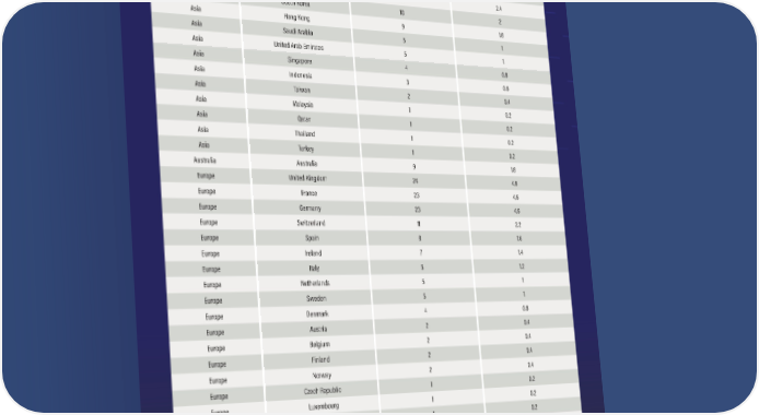 35 Continent Country Number of Companies (Total = 500) Percentage (%) Africa South Africa 1 0.2 Asia China 59 11.8 Asia Japan 39 7.8 Asia India 12 2.4 Asia South Korea 10 2 Asia Hong Kong 9 1.8 Asia Saudi Arabia 5 1 Asia United Arab Emirates 5 1 Asia Singapore 4 0.8 Asia Indonesia 3 0.6 Asia Taiwan 2 0.4 Asia Malaysia 1 0.2 Asia Qatar 1 0.2 Asia Thailand 1 0.2 Asia Turkey 1 0.2 Australia Australia 9 1.8 Europe United Kingdom 24 4.8 Europe France 23 4.6 Europe Germany 23 4.6 Europe Switzerland 11 2.2 Europe Spain 8 1.6 Europe Ireland 7 1.4 Europe Italy 6 1.2 Europe Netherlands 5 1 Europe Sweden 5 1 Europe Denmark 4 0.8 Europe Austria 2 0.4 Europe Belgium 2 0.4 Europe Finland 2 0.4 Europe Norway 2 0.4 Europe Czech Republic 1 0.2 Europe Luxembourg 1 0.2 Europe Poland 1 0.2 North America United States 178 35.6 North America Canada 22 4.4 North America Mexico 4 0.8 South America Brazil 6 1.2 South America Colombia 1 0.2 35