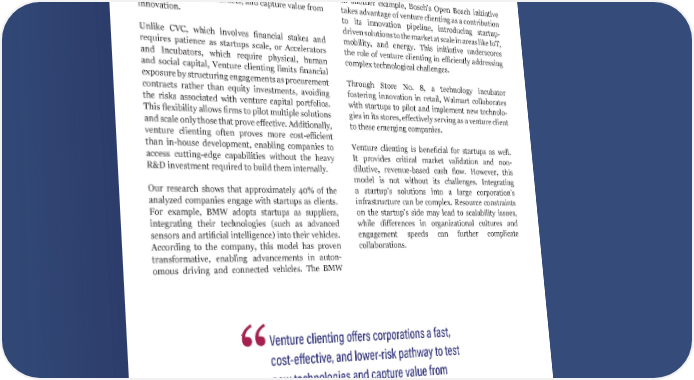 18 Venture Clienting as a Launchpad for Innovation Staying ahead in our fast-changing business world requires large organizations to adopt and implement innovations faster and cheaper than traditional CVC allows. Venture clienting has emerged as a key tool for doing so. It offers corporations a fast, cost- effective, and lower-risk pathway to test new technol- ogies, bring them to markets, and capture value from innovation. Unlike CVC, which involves financial stakes and requires patience as startups scale, or Accelerators and Incubators, which require physical, human and social capital, Venture clienting limits financial exposure by structuring engagements as procurement contracts rather than equity investments, avoiding the risks associated with venture capital portfolios. This flexibility allows firms to pilot multiple solutions and scale only those that prove effective. Additionally, venture clienting often proves more cost-efficient than in-house development, enabling companies to access cutting-edge capabilities without the heavy R&D investment required to build them internally. Our research shows that approximately 40% of the analyzed companies engage with startups as clients. For example, BMW adopts startups as suppliers, integrating their technologies (such as advanced sensors and artificial intelligence) into their vehicles. According to the company, this model has proven transformative, enabling advancements in auton- omous driving and connected vehicles. The BMW Garage has therefore become a model in Venturing Clienting success, exemplifying how corporations can derive substantial innovation benefits without taking equity. In another example, Bosch’s Open Bosch initiative takes advantage of venture clienting as a contribution to its innovation pipeline, introducing startup- driven solutions to the market at scale in areas like IoT, mobility, and energy. This initiative underscores the role of venture clienting in efficiently addressing complex technological challenges. Through Store No. 8, a technology incubator fostering innovation in retail, Walmart collaborates with startups to pilot and implement new technolo- gies in its stores, effectively serving as a venture client to these emerging companies. Venture clienting is beneficial for startups as well. It provides critical market validation and non- dilutive, revenue-based cash flow. However, this model is not without its challenges. Integrating a startup’s solutions into a large corporation’s infrastructure can be complex. Resource constraints on the startup’s side may lead to scalability issues, while differences in organizational cultures and engagement speeds can further complicate collaborations. Venture clienting offers corporations a fast, cost-effective, and lower-risk pathway to test new technologies and capture value from innovation. “