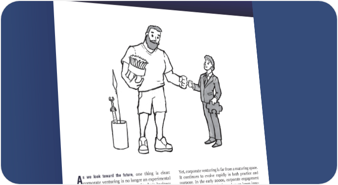 32 A s we look toward the future, one thing is clear: corporate venturing is no longer an experimental trend — it is a defining feature of today’s business landscape. We have entered an era where collabo- ration between startups and incumbent firms is not the exception but the norm. Once seen primarily as threats to established businesses, startups are now increasingly recognized as essential partners in navigating complex, dynamic markets. Yet, corporate venturing is far from a maturing space. It continues to evolve rapidly in both practice and purpose. In the early 2000s, corporate engagement with startups was largely framed as an ‘open inno- vation’ strategy: a way to access external ideas and technologies to supplement internal R&D. Today, the goals are more diverse and often more ambitious. While external innovation remains important, corporate venturing now also serves a broader array Conclusion: David and Goliath, Reimagined